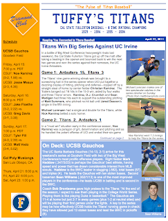 Cal State Fullerton hit a bump in the road last weekend on their trip up the 101 to SLO as the Titans lost two out of three games in their series with Cal Poly for their first Big West series loss since 2009 and followed that up with midweek loss at San Diego on Tuesday. Fullerton had only lost twice in their previous 21 games before losing three of last four games as injuries have taken their toll on the team.